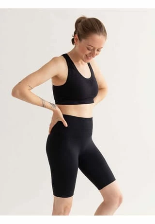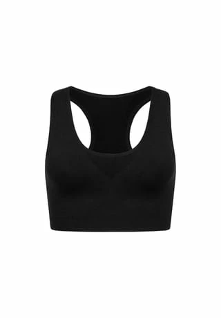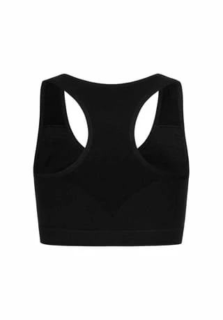 – sportliches Bustier mit breiten Trägern – funktionelles Stretchmaterial mit hohem Recycling-Anteil – breites geripptes Unterbrustband – eingedrucktes Pflegeetikett – mit „PETA-Approved Vegan“ Label – das Model ist 1,68 m groß und trägt Größe L