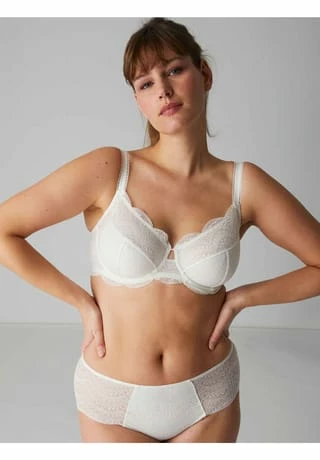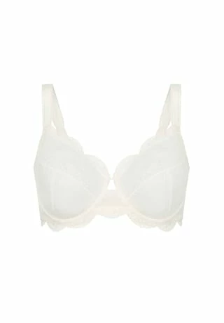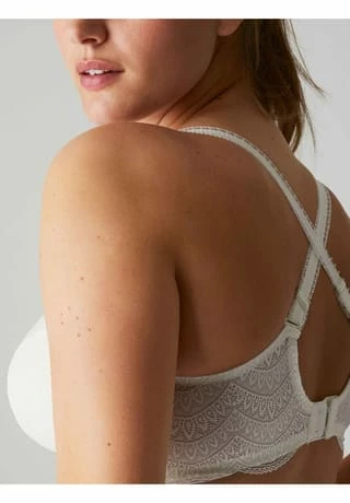 – Bügel-BH, Big Cup – semitransparente, grafische Jacquard-Spitze – vierteilige Support-Cups – halbhoher Mittelsteg mit Cut-Out – Bogenspitze an Obercup und Unterbrustband – breitere Seitenteile – U-förmiges Rückendesign – breite, variable Träger – zweireihiger, 3-fach verstellbarer Häkchenverschluss